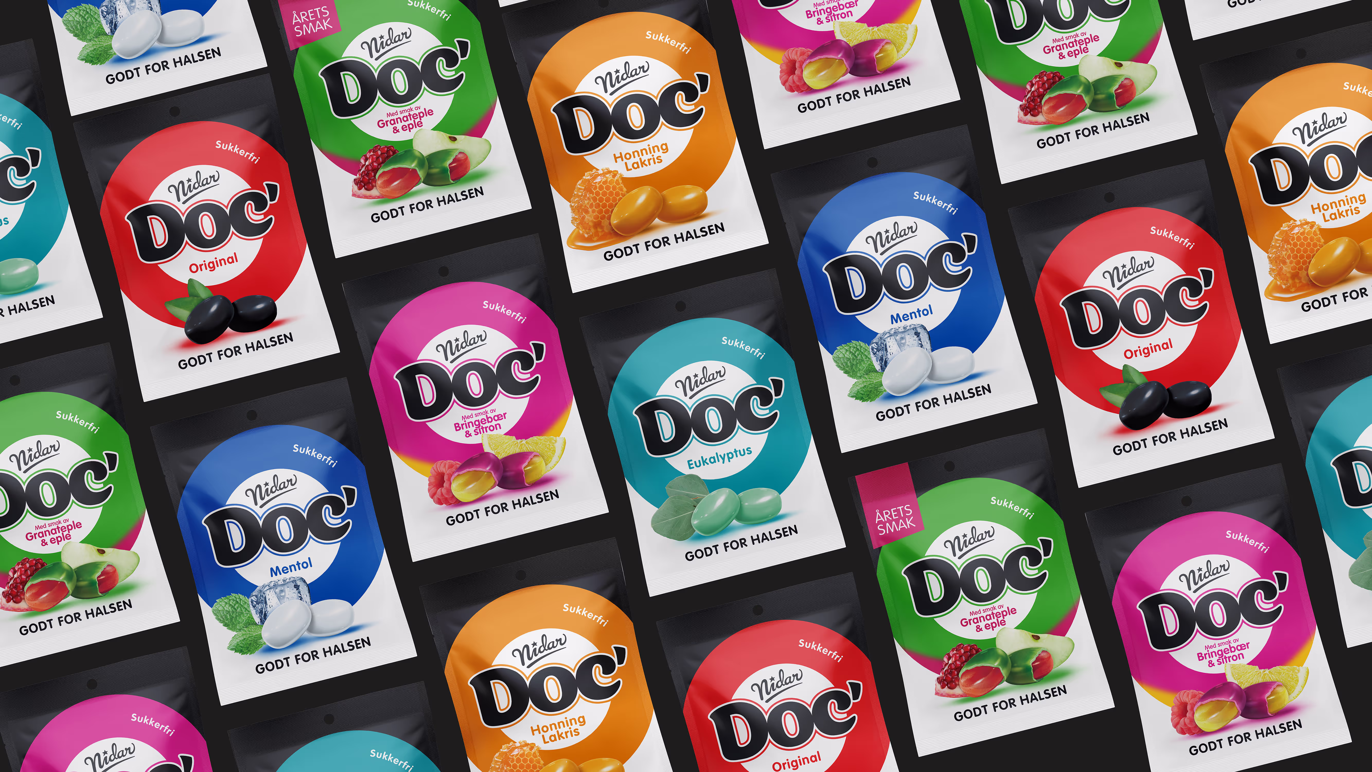 Design House har revitalisert klassikeren Doc' ved å utvikle en sterk og særpreget identitet. Ordbildet i den stolte Doc-logoen er tegnet om, forenklet, gjort boldere og rettet opp. Bak logoen ligger et felles merkeelement, som fungerer tydelig på fjernsignal og gir et sterkt seriepreg. De klare fargene gjør det enkelt å skille variantene fra hverandre. Designet fremstår nå ikonisk, rent og smakfullt. Moderniseringen skaper fristelse for forbrukeren, samtidig som den understreker Doc’s troverdighet som en halspastill som har lindrende effekt.