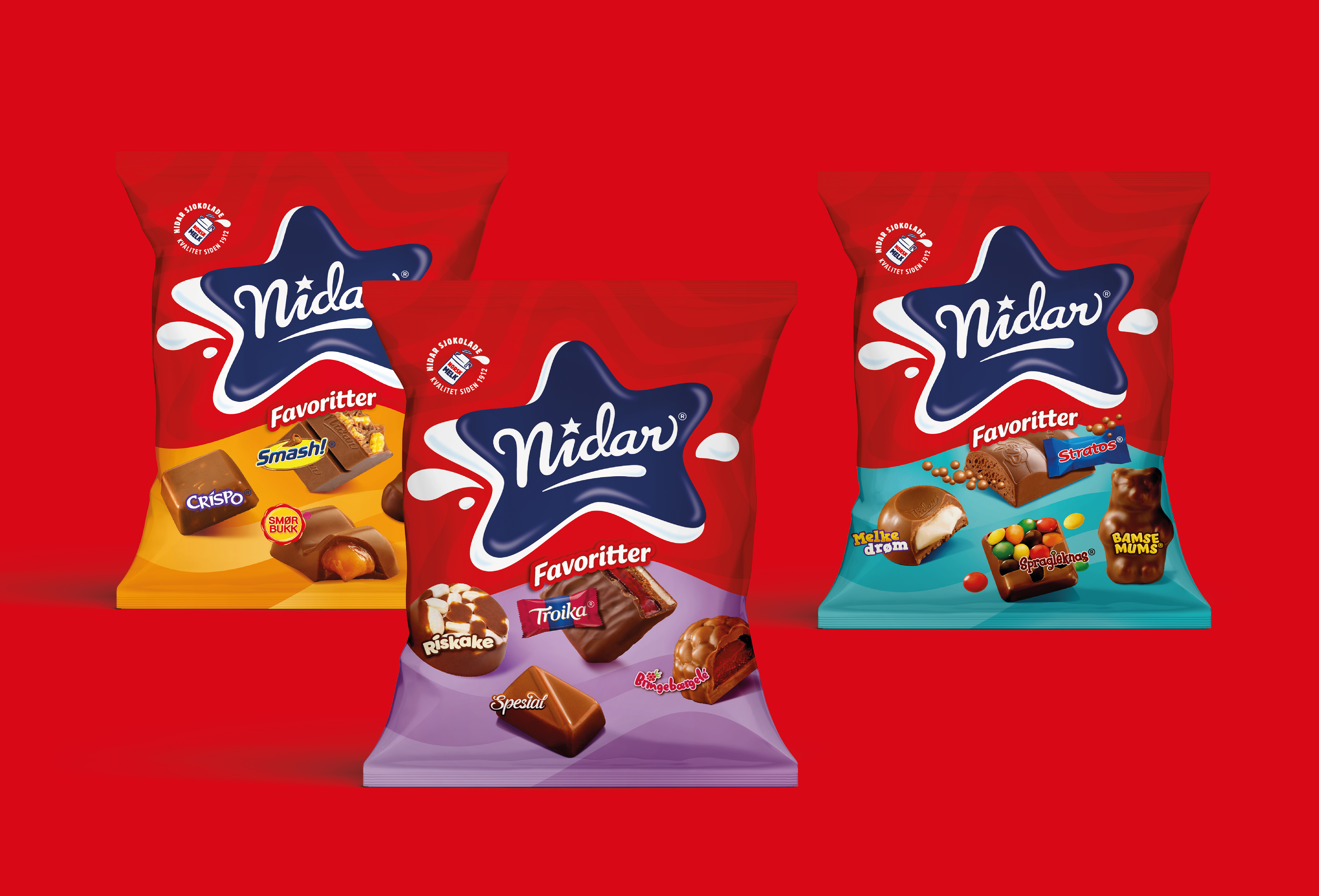 Vi har gitt Nidar Favoritter en ny visuell identitet med en logo som sprudler av energi, stolthet og ekte sjokoladeglede. Uttrykket løfter frem det viktigste: smaken, kvaliteten og den gode følelsen av sjokolade laget i Norge på norsk melk. Den røde, hvite og blå fargepaletten samler serien tydeligere og styrker den norske forankringen, samtidig som egne kodefarger gjør det enkelt for forbrukerne å finne sin favoritt raskt. Stjernen skaper organiske ripler i bakgrunnen og sammen med blank lakk på logo og sjokoladebiter mot matte flater, gir dette et taktilt preg. Resultatet er en mer synlig, leken og fristende serie i butikk.