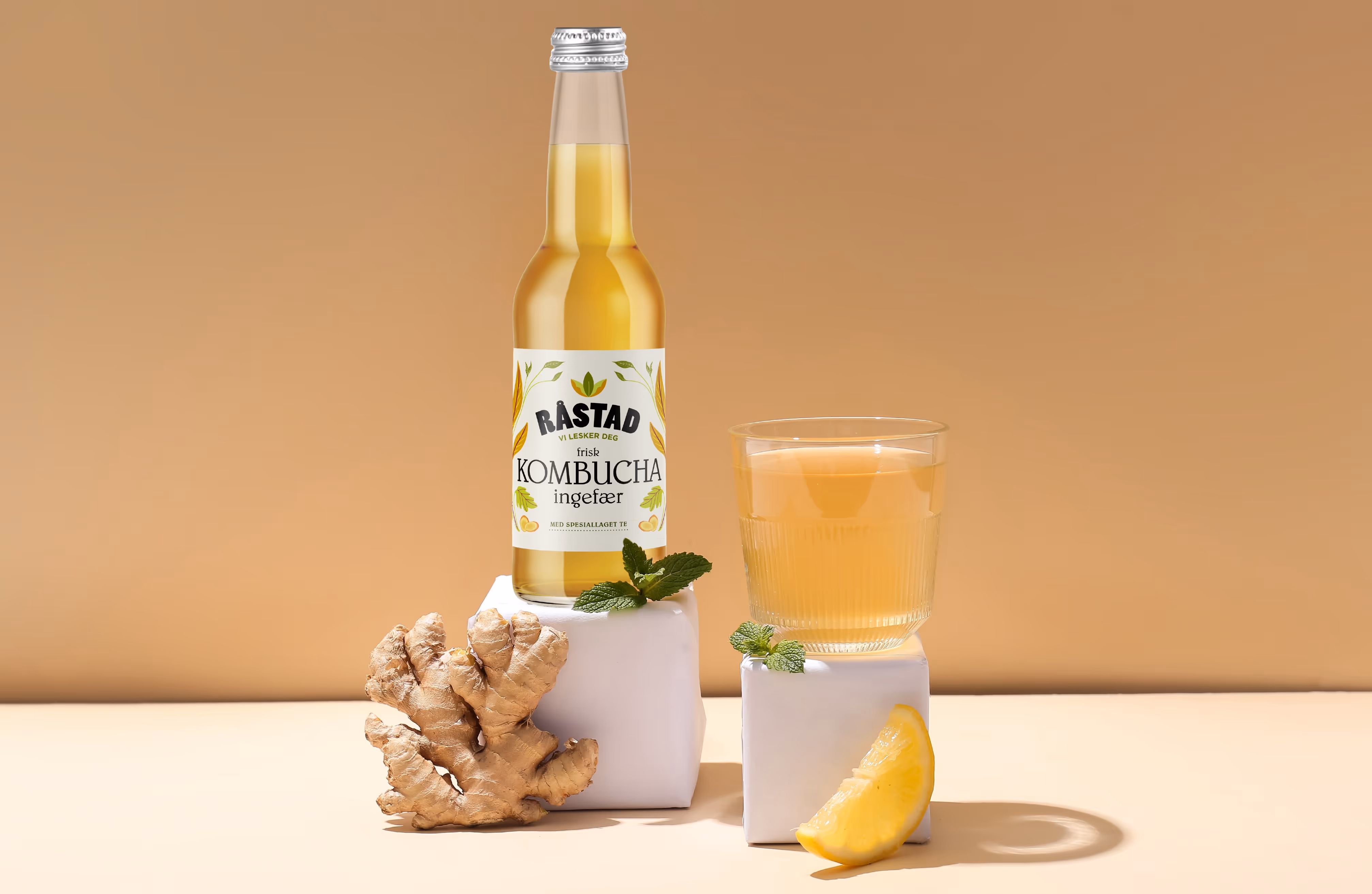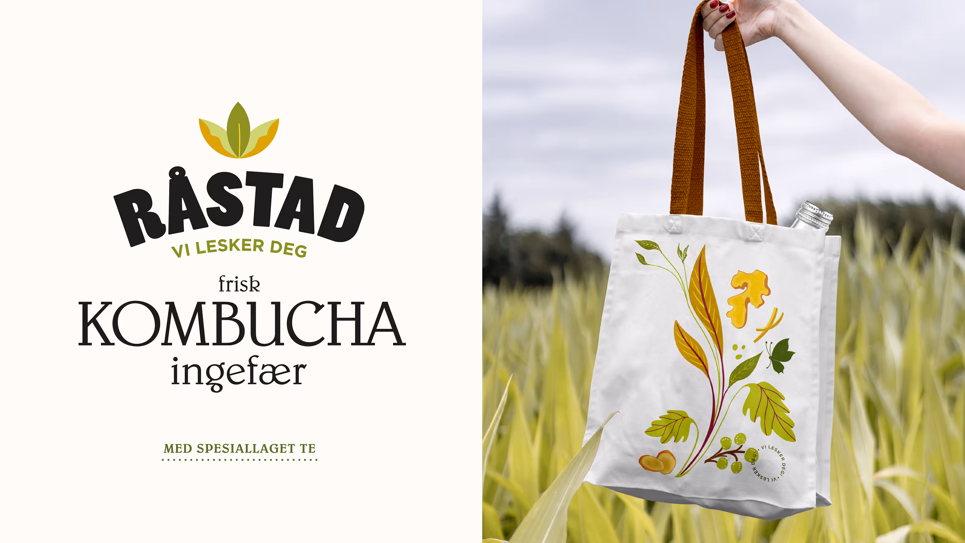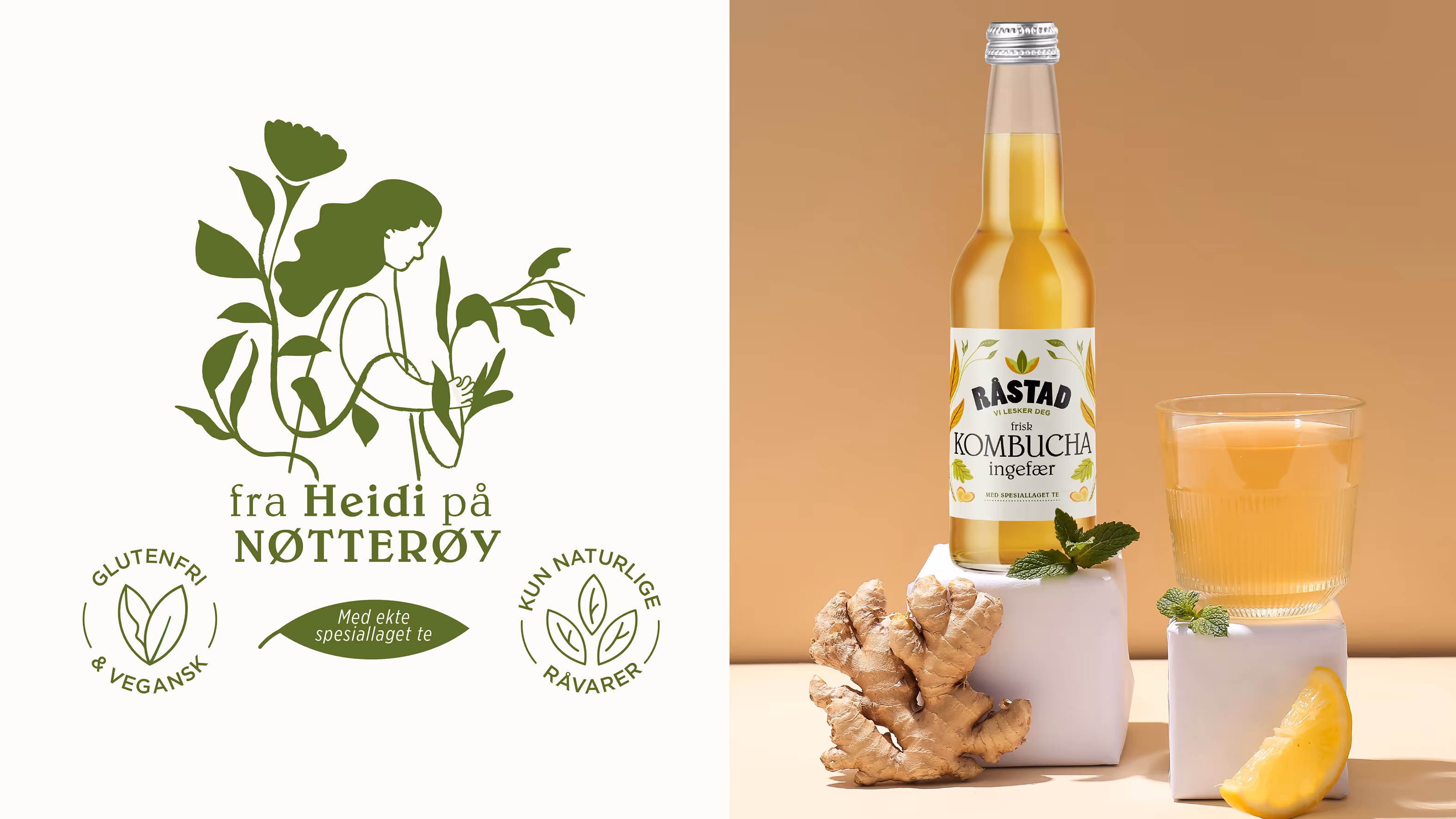 Råstad Kombucha - en lokal produsent fra Nøtterøy i Vestfold. Et nytt redesign forsterker at dette er et håndverksprodukt drevet av lidenskapelige Heidi med en genuin interesse for smak, kvalitet og helse. Bladene i designet representerer teplanten – hjertet i kombucha – og illustrasjonene gir en følelse av naturlighet, håndverk og nærhet. Med sterk lokal forankring, moderne smaker og autentisk design treffer vi en målgruppe som verdsetter bærekraft, kvalitet og gode råvarer. Resultatet er et designuttrykk som bygger tillit hos forbruker, og en kombucha som både føles og smaker autentisk.